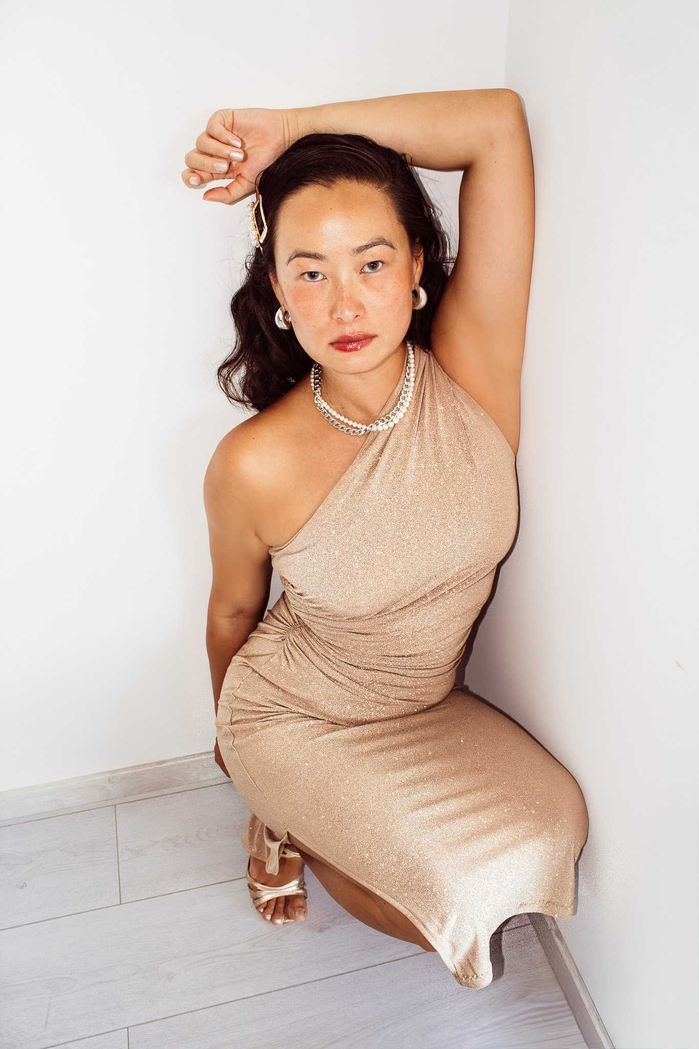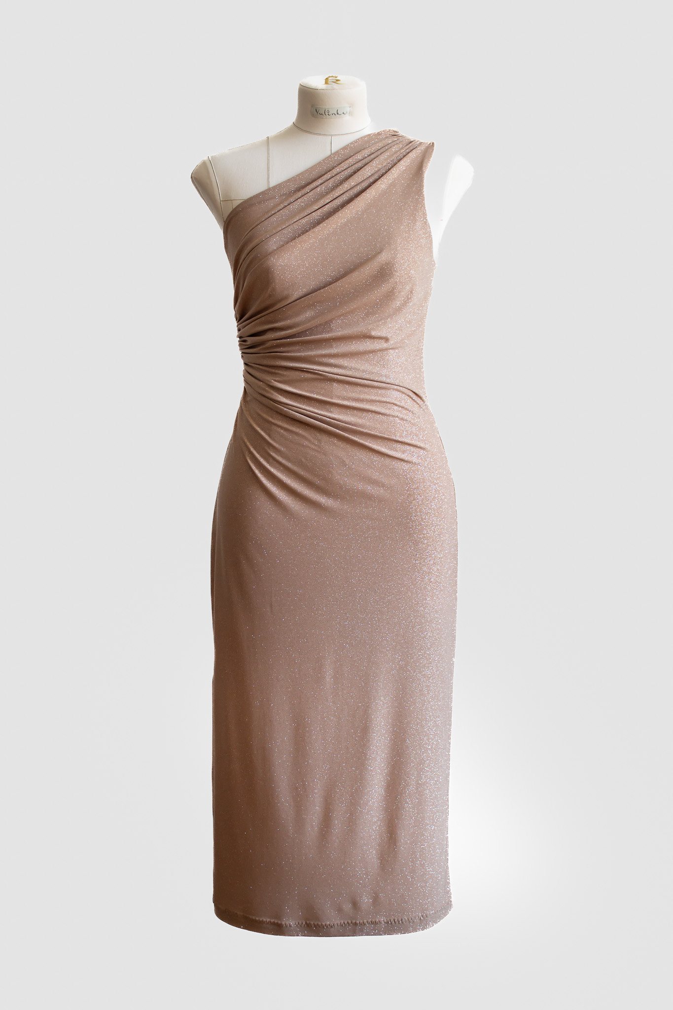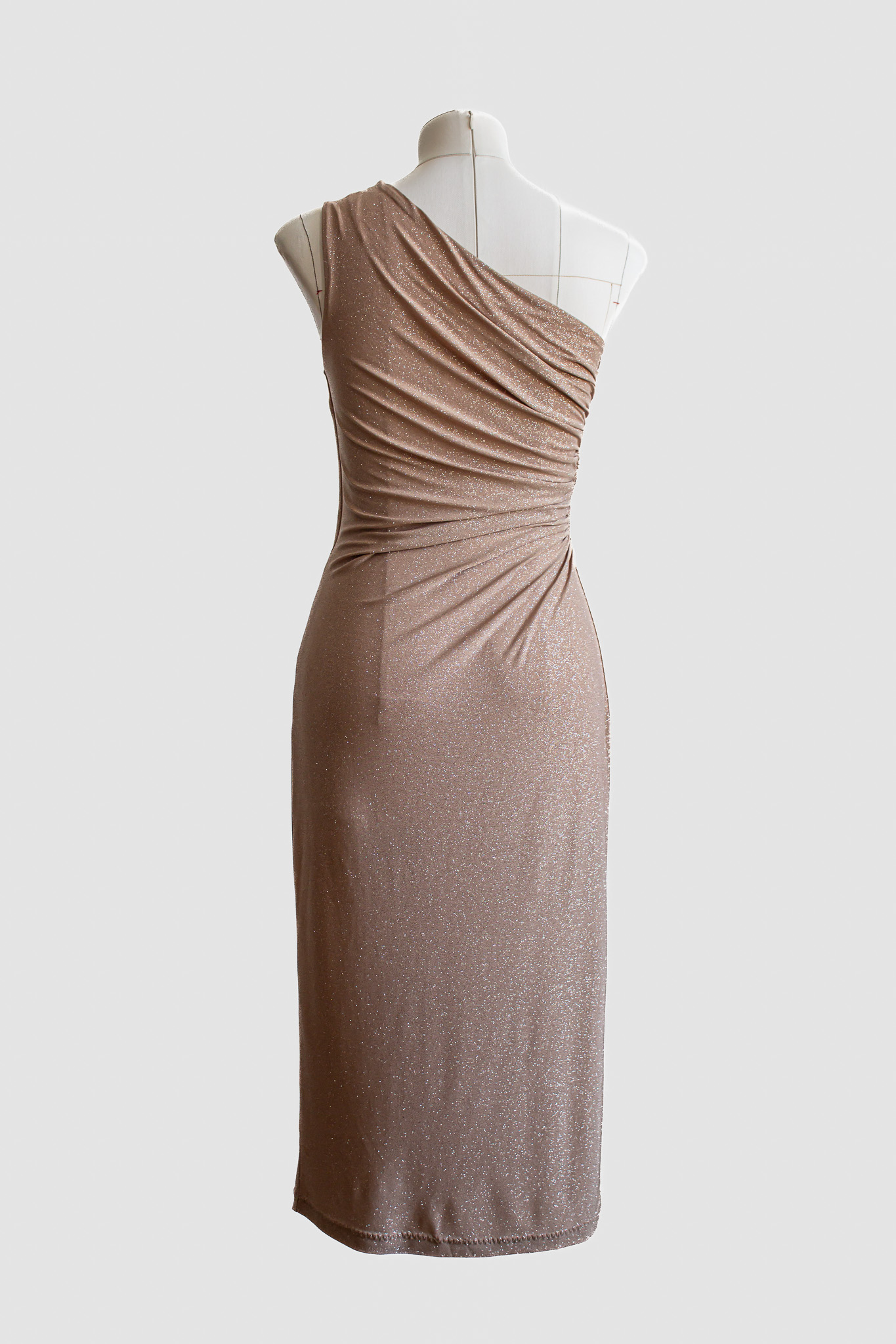 One-Shoulder draped Midi Dress — Champagne Shimmer