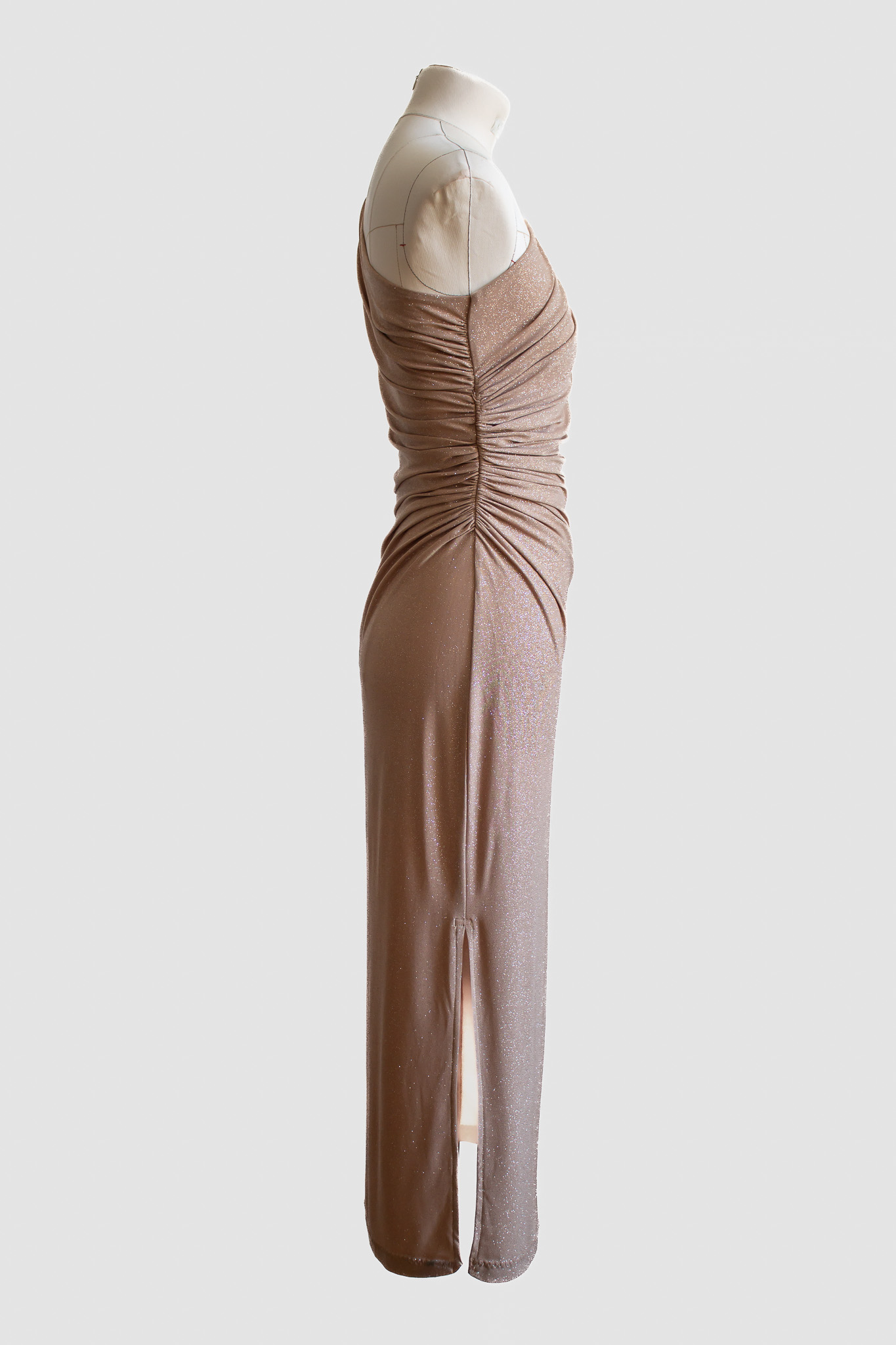 A sleek, body-skimming midi with a soft sparkle. The asymmetric one-shoulder neckline and diagonal draping sculpt the waist, while a side slit frees your stride—elegant on the floor and after dark