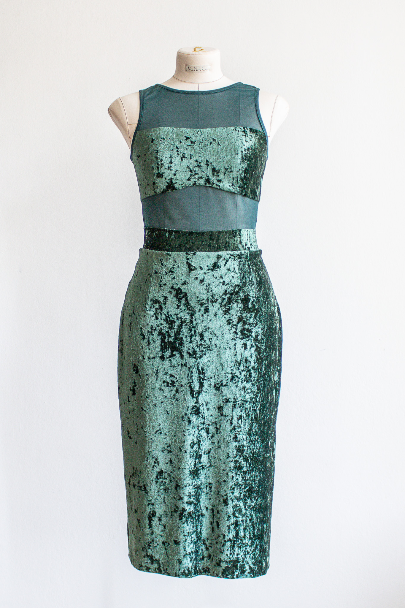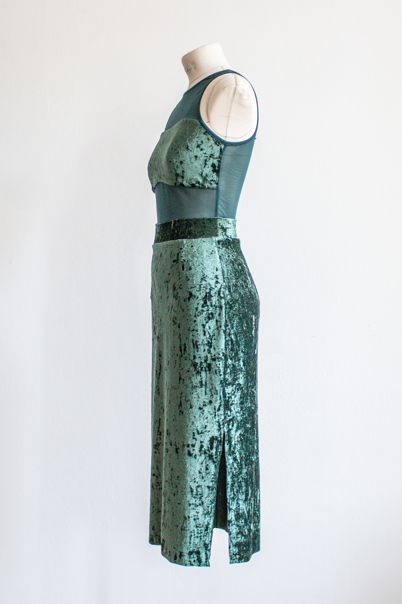 Illusion mesh midriff; pencil skirt with side slit